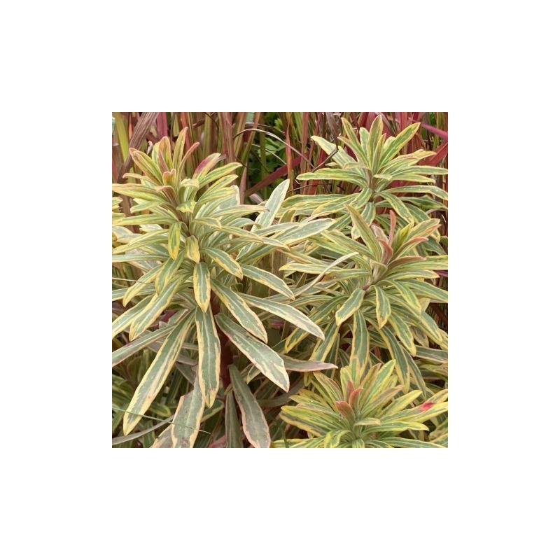 Beau feuillage persistant panaché, pousses printanières rouges et bractées jaunes très attractives au printemps ; port en touffe arrondie.