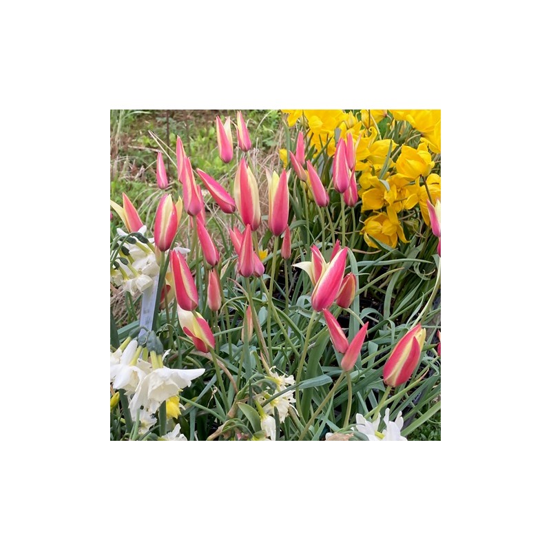 Petite tulipe botanique fraiche et gracieuse, fines fleurs élancées  rose et jaune doux au printemps ; bonne terre de jardin, soleil.