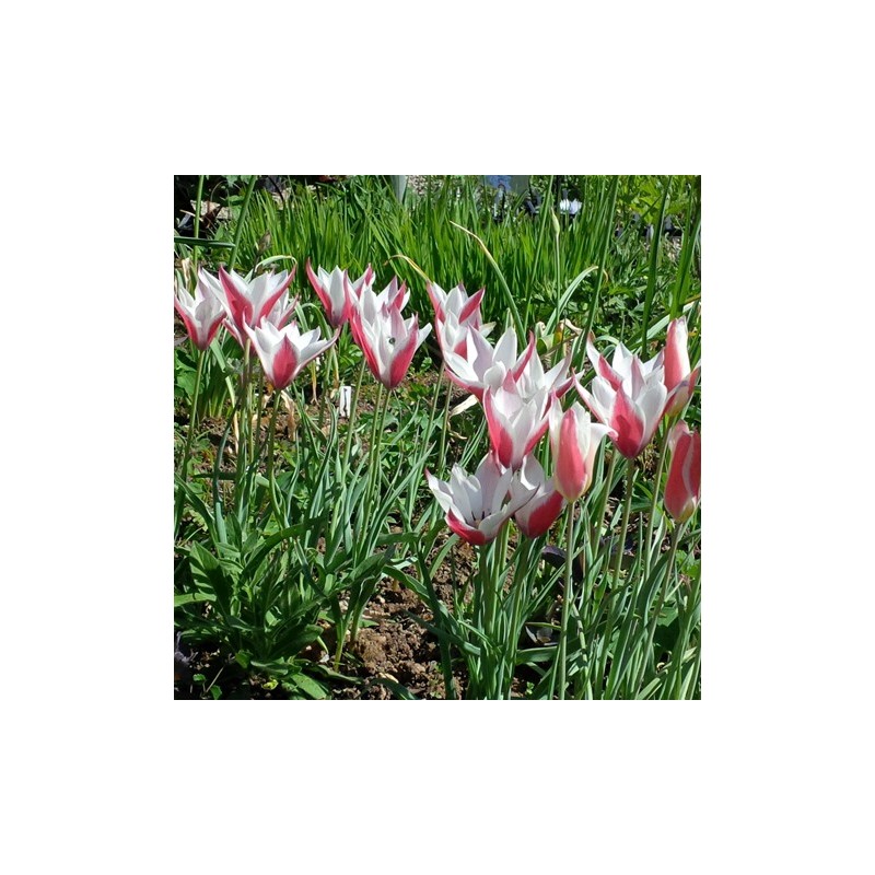 Petite tulipe botanique fraiche et gracieuse, fines fleurs élancées  rose et blanc au printemps ; bonne terre de jardin, soleil.